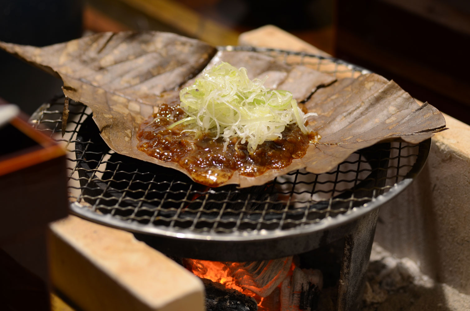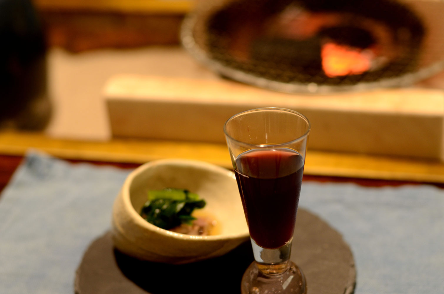 古民家なしつらえの個室のテーブルにはちょっとした囲炉裏が切られ、炭がオレンジ色を放っている。