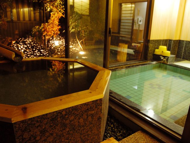 桧の貸切露天風呂 温泉町とつながった普段着の宿 ひっそりと静まりかえった露天風呂は、朝の喜びにあ