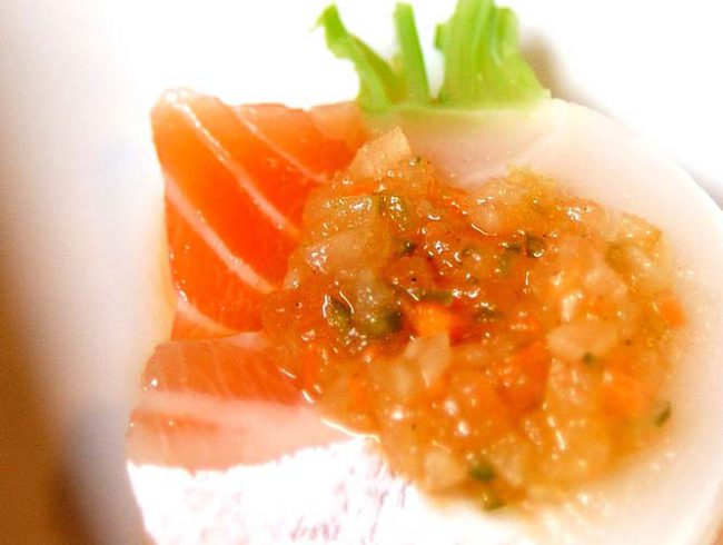 5. 魚恵はたぶん過渡期を迎えているのではと感じます。お客さんの層・種の変化により、いままで問題にならなかったことが問題になってしまっているような・・・。もともと地元のお客さんがほとんどで、遠くからのお客さんでも長野や岐阜あたりまでという民宿ですが、近頃、いくつかの有力な雑誌で取り上げられ始めてから、東京、大阪などの大都市圏のお客さんが増えてきているようで、否応なしに、「全国」という土俵で見られるようになってきています。しかし、依然として半分は地元や県内のお客さん。「盛り付けなんて気取ってないで、新鮮な魚をどんどんもってきて」といったボリュームと鮮度命の豪快料理、ちから技の料理を好むお客さんを無視しては宿が成り立たないという事情もなんとなく私は感じます。たとえば料理の出すタイミングや品数の多さなど課題はあります。もうすこし量を減らして、多少の心残りを感じさせるほうが私などは後ろ髪を引かれる思いがするでしょう。たとえば長ーいまな板に盛られる造りは私などは量を減らして氷にのせて出せばと思います。地元のお客さんに言わせると「なん、きどっとんが!」(富山弁:なに気取ってるんだの意)と文句を言うでしょう。魚恵がこれから「うちは民宿だから・・・」というスタンスをとるのかもう一段上を目指すのか、私も興味があります。