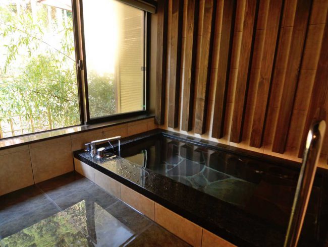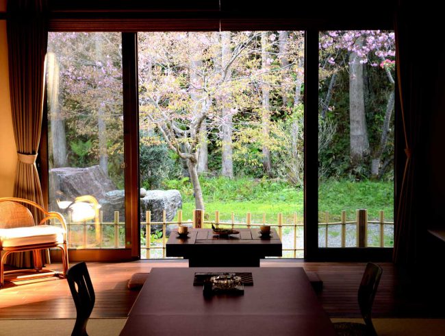 部屋に戻ると、部屋の前の小さな庭がライトアップされていて、八重桜が漆黒の夜に浮かび上がっている。