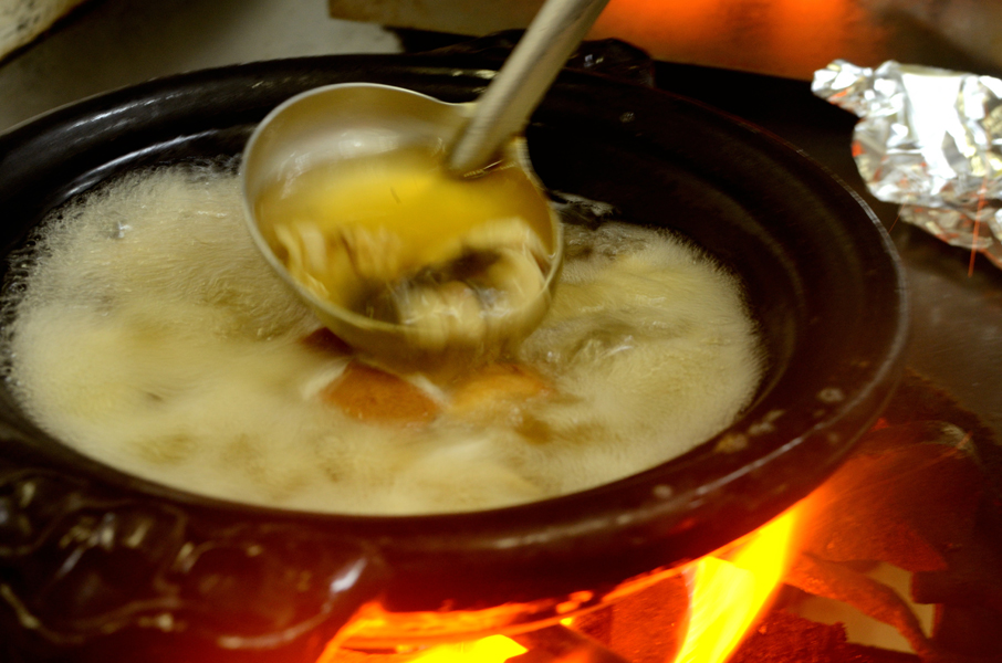 高温に熱した大きな鍋にうなぎのだし汁をドバドバと投入。