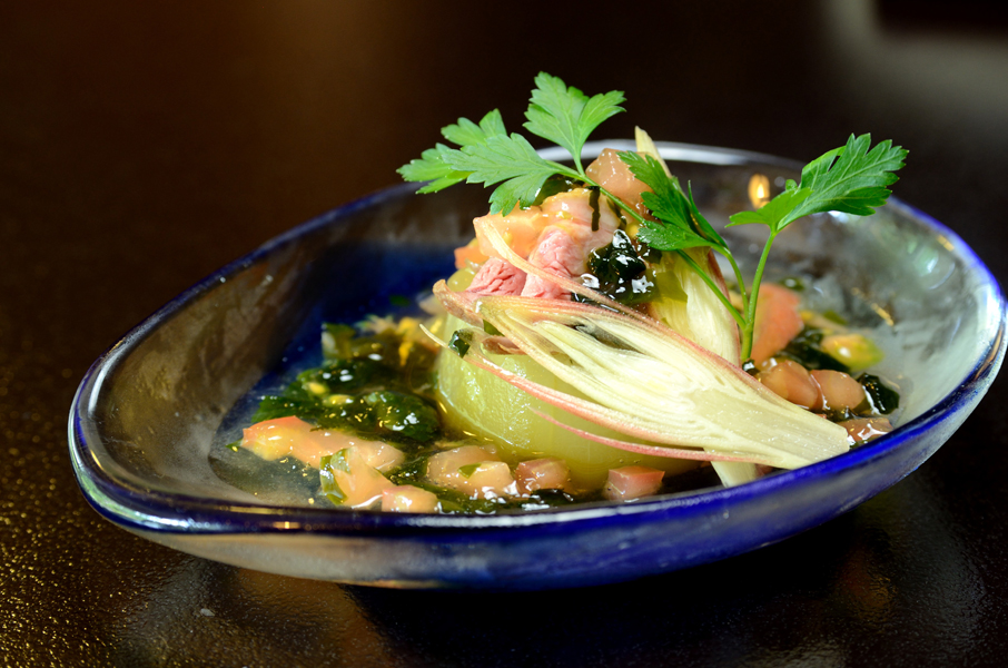 加賀野菜の加賀太胡瓜を煮て土佐酢のジュレで。