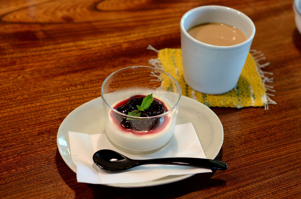 トロリと濃厚なレアチーズケーキ。ブルーベリーは鳴子の遊佐文博さんが育てたものらしい。