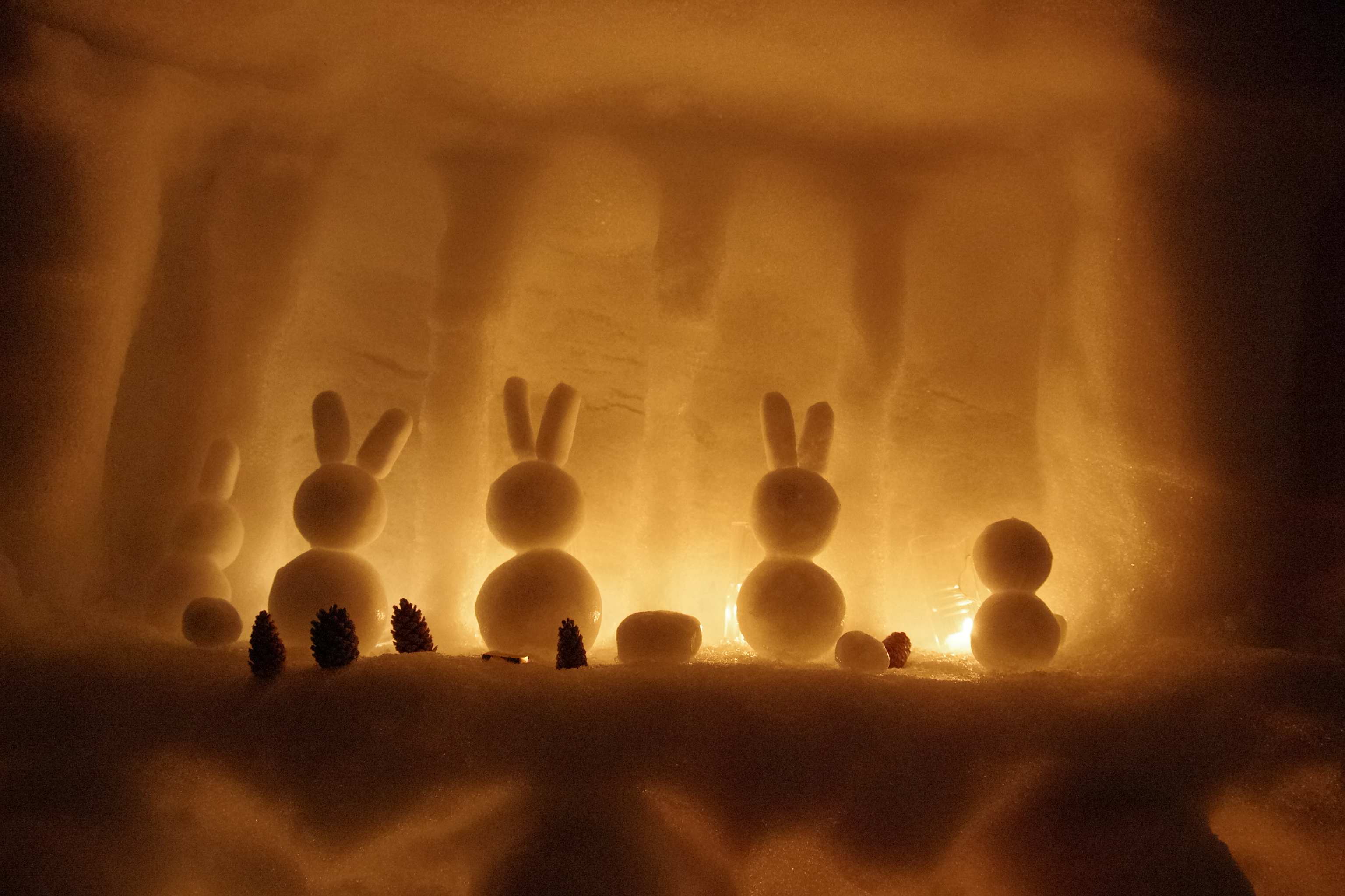 雪旅籠の中は、キャンドルの炎のお陰かほんのりあったかく感じます。