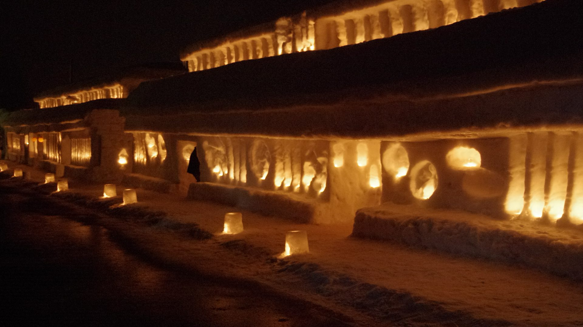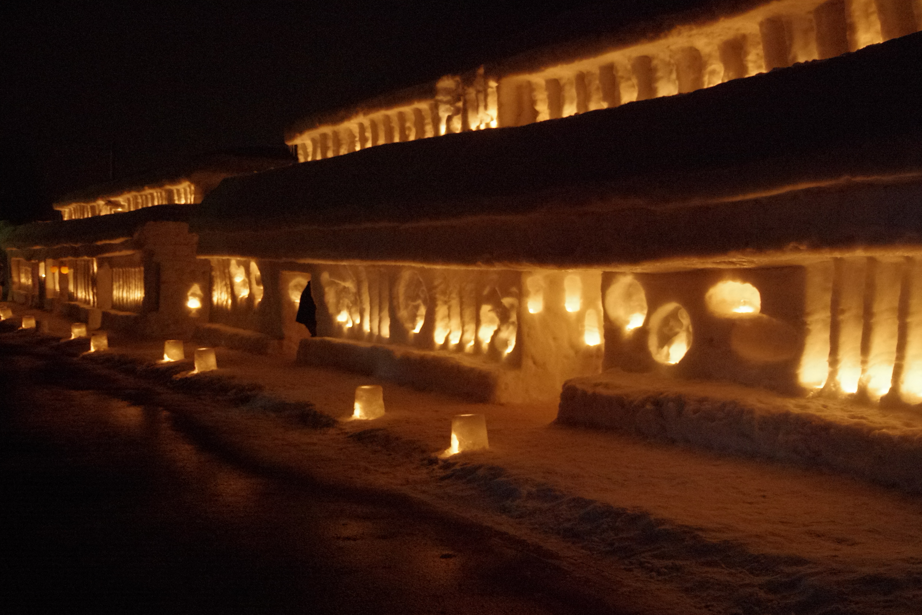 夜の闇に無数のキャンドルの灯りで照らされた雪旅籠は、暖かくも幻想的です。