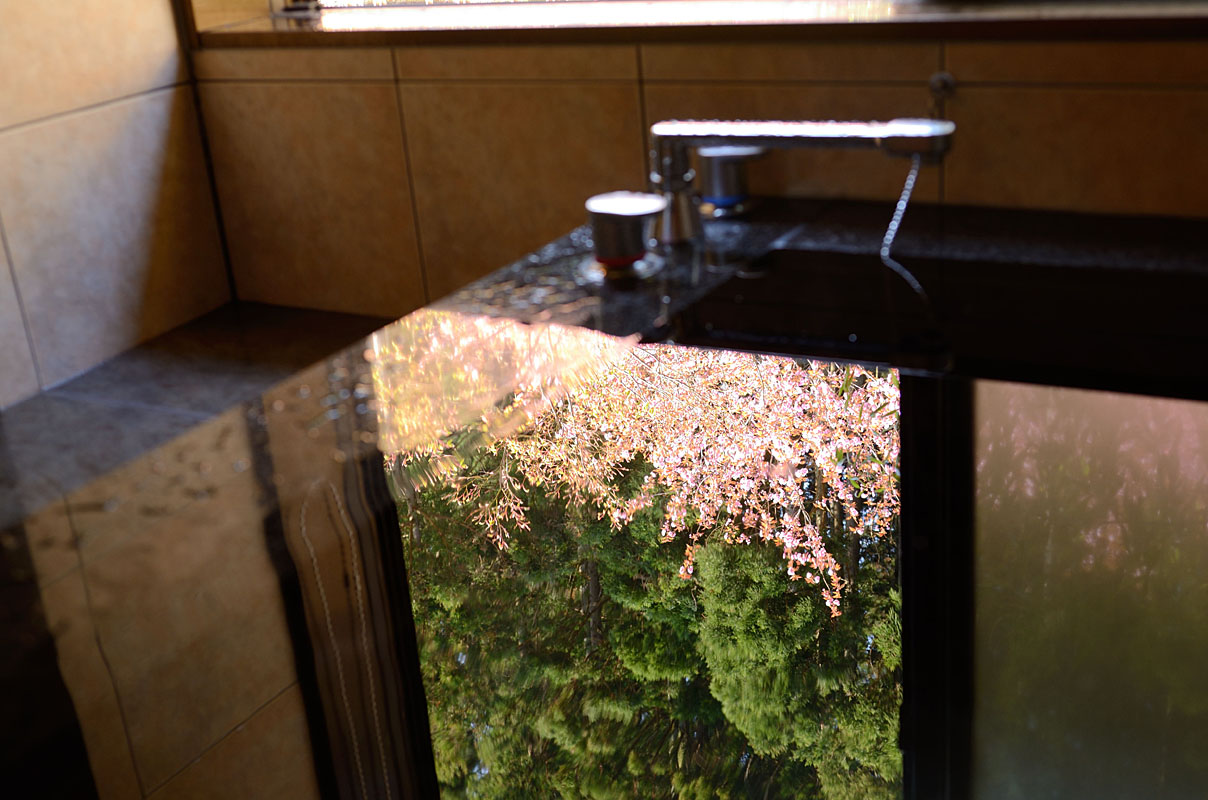風呂から眺める庭では八重桜がちょうど見ごろ。
