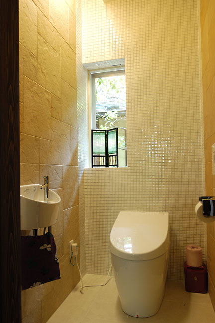 トイレ、洗面所、ともに白いタイルの洋風テイスト。なのにトイレのお手拭きが手ぬぐいなのがミスマッチで粋だ。連れがいたく気に入っていた。