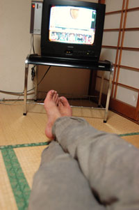 温泉にもはいり、食事も頂き、だらしない格好でテレビを見ている図。