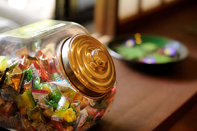 写真は、栃尾又温泉 宝巌堂の帳場付近においてあるあめ。駄菓子屋っぽくていいでしょ?