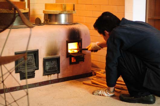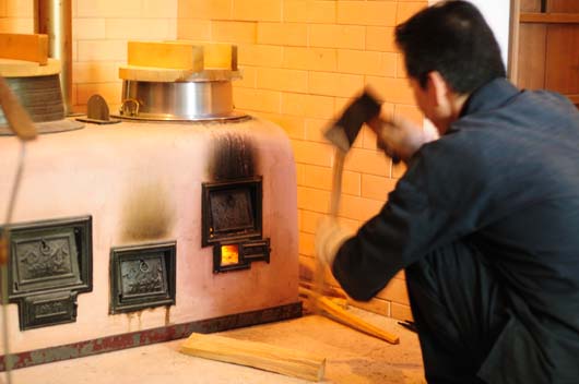 ご主人が釜戸をいじっているところだった。きっと日課なのでしょう。