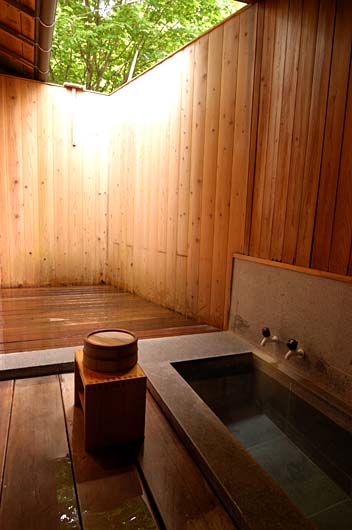一度部屋を出て通路をはさんだ反対側に専用の露天風呂があるが、正直なところ湯舟はかなり狭く、完全に一人専用。一人でも身動きは取れないくらいだと思ってください。