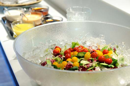 サラダはオープンキッチンのカウンターにビュッフェスタイル(バイキングと言ってはいけない)で盛られています。氷にのせられてシャッキシャキ。ドレッシングがその奥に5種類くらい見えますね。