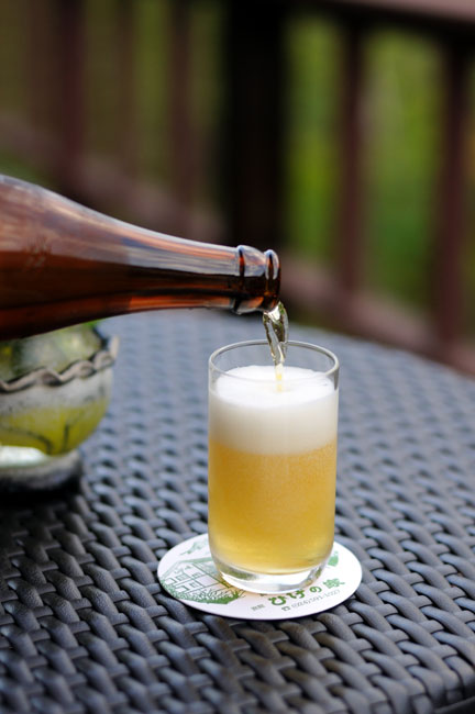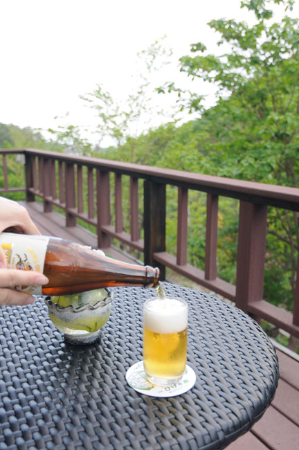 風呂から上がってきて、テラスでぶらぶらしていると、 「ここでビール飲めますよ。」 天使からの甘いささやきに、連れは ひとたまりもない 次の瞬間、こういうことになるわけでして。 ズーム 新緑の山を愛でながらの一杯。 格別ですね。