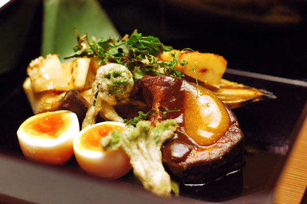 今月の特薦料理「朝掘り筍の土佐醍醐焼きと フレッシュフォアグラの八丁あんぽだれ 烏骨鶏のレア玉子をそえて」