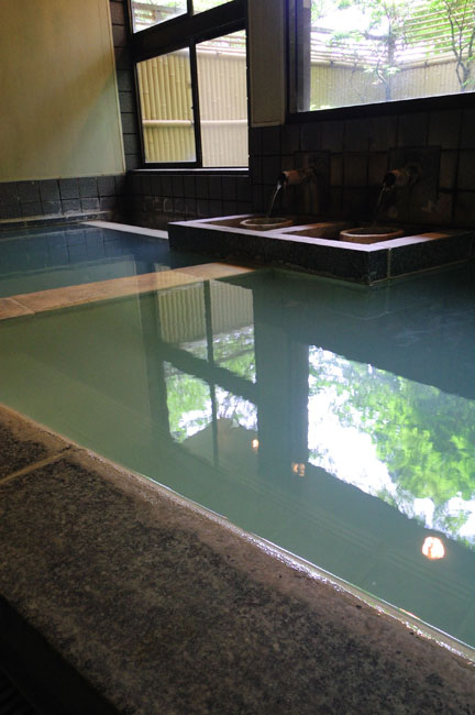 まず、美しいエメラルドグリーンの湯、そして硫黄泉なのに弱アルカリ性という、他にほとんど例を見ない希少性の高い湯。
