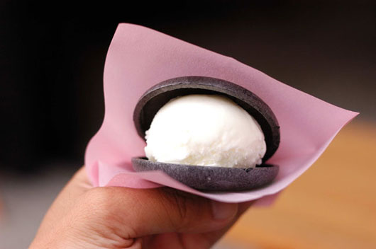 能登のフレッシュミルクジェラートが黒い竹炭入りの最中に挟まれている。