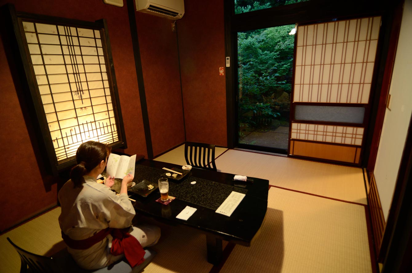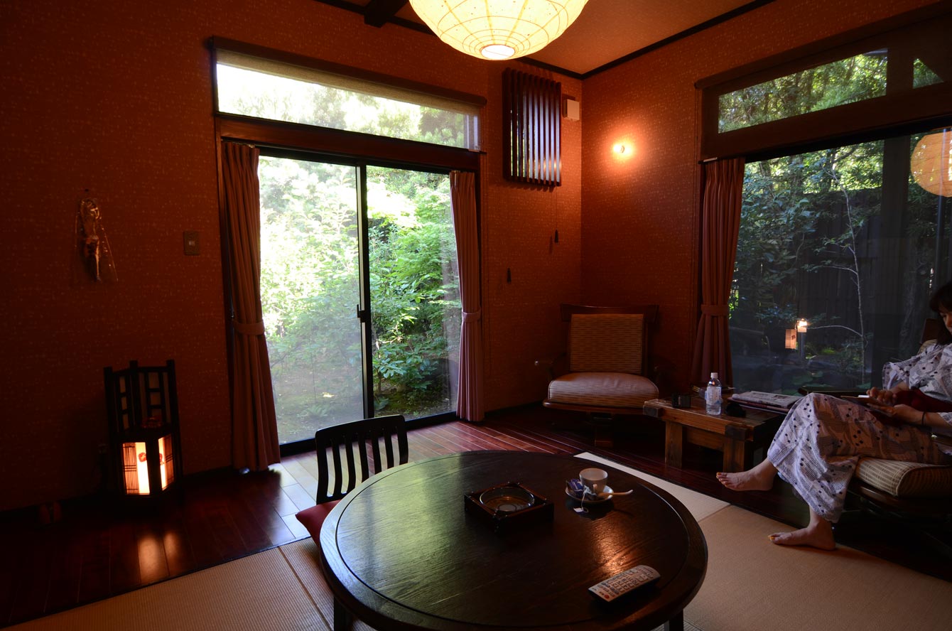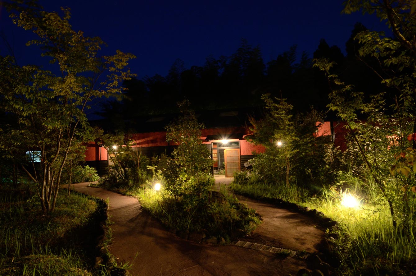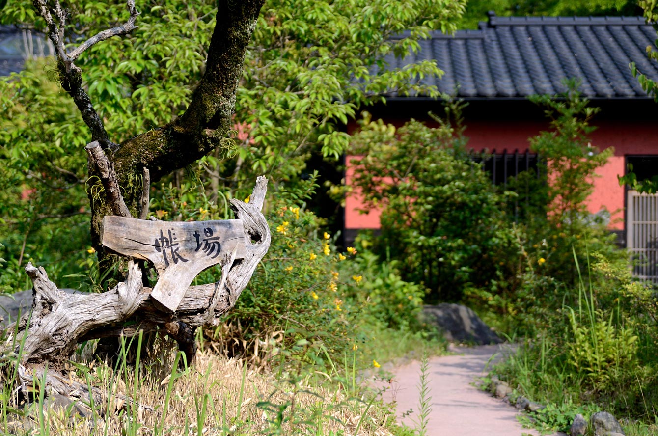 ここは霧島温泉郷の中心地から外れたところ。こんなところに森などあるもんか、と不安になりながらたどり着いた場所。駐車場から結界のような竹林を男性スタッフが僕らの荷物を持って先導していく。その先が帳場のある母屋だ。夏のさなかにひんやりした風が母屋を抜けていく。