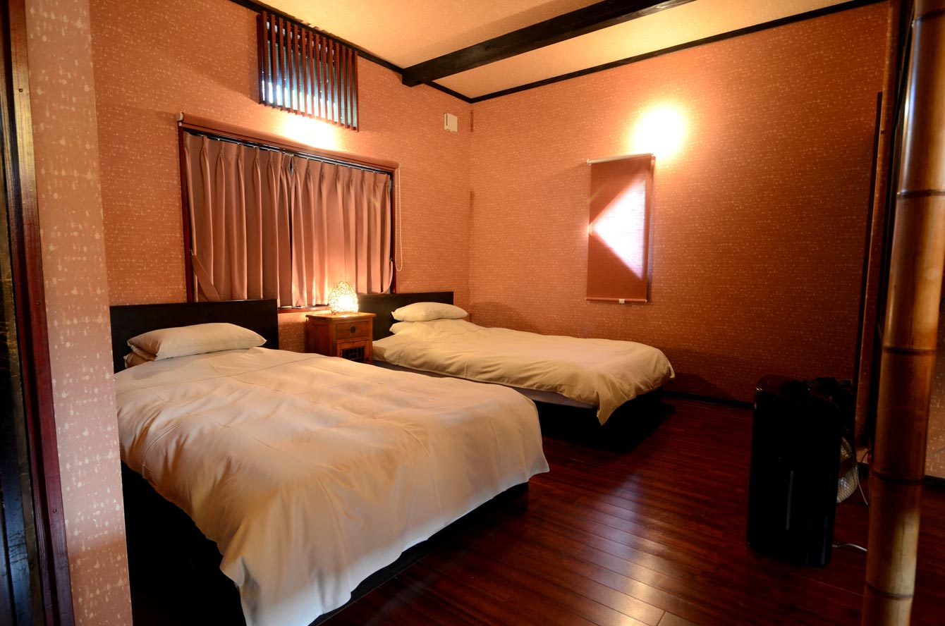 ベッドルーム。 ベッドルームはリビングと竹のつい立でやんわりと仕切られている。料理の余韻にずっと浸っていたらだいぶ夜も更けていた。