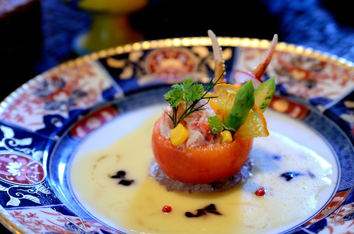 艶やかな大振りのお皿に埋もれるどころか、存在感を放つその姿にしばし見とれる。ズワイガニの繊細さと甘いフルーツトマトに食欲をつっつかれてディナーの幕開け。