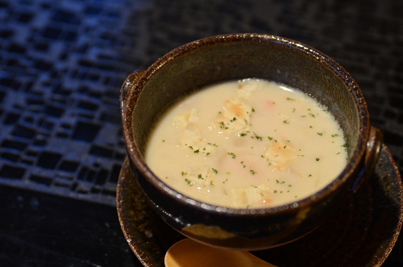 クラムチャウダー 貝の旨みがしっかり溶け出し、クリームの豊かな濃くが包み込んでいます。湧き立った僕らをいったん穏やかにしてくれた。