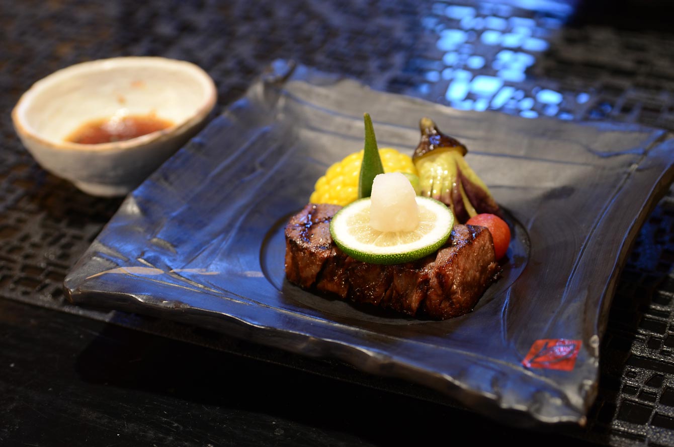 鹿児島県産・黒毛和牛フィレ網焼きステーキ みぞれ酢ソースで 上質なフィレ肉!ぼくは駄々っ子のように体を揺らし始めた。お向かいさんに目をやると箸をおいて瞑想中。やおらムンズとビールグラスを握った。
