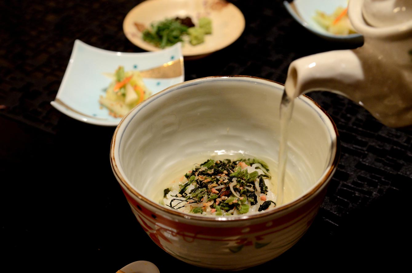 鮭ちりめんのだし茶漬け、香の物