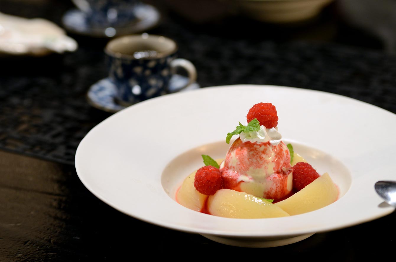 桃のムースに桃のコンポート・バニラアイス フランボアーズソースで(ピーチメルバ)・・・ スウィーツ大好きなわれわれは、ここで再びピークを迎えるのでした。