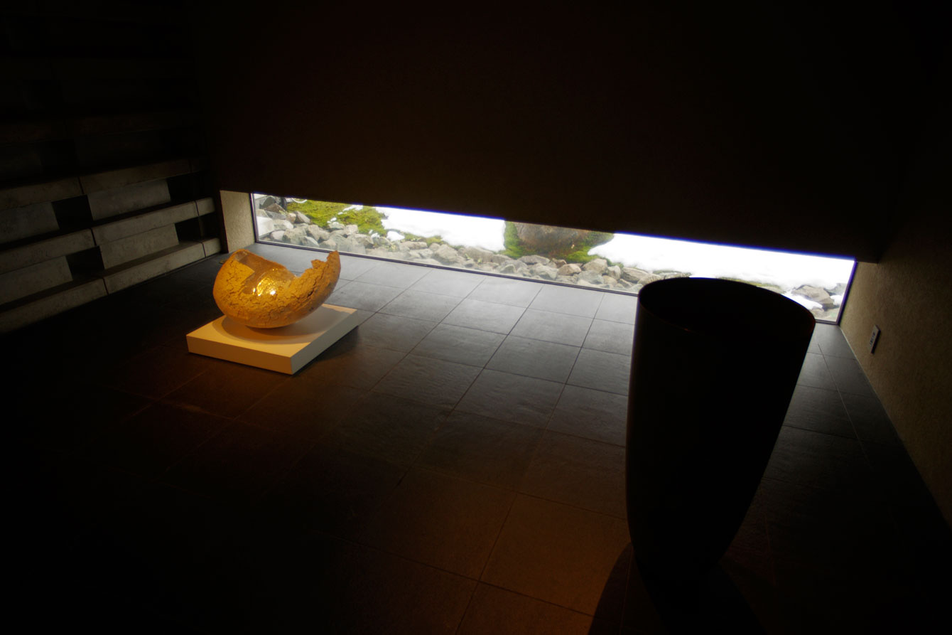球体のあるテラス。ロビー方向には安藤忠雄の「光の教会」のように切り抜かれた十字架もあります。きっと結婚式にも使われるんでしょうね。
