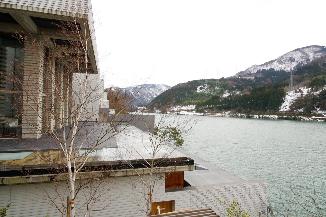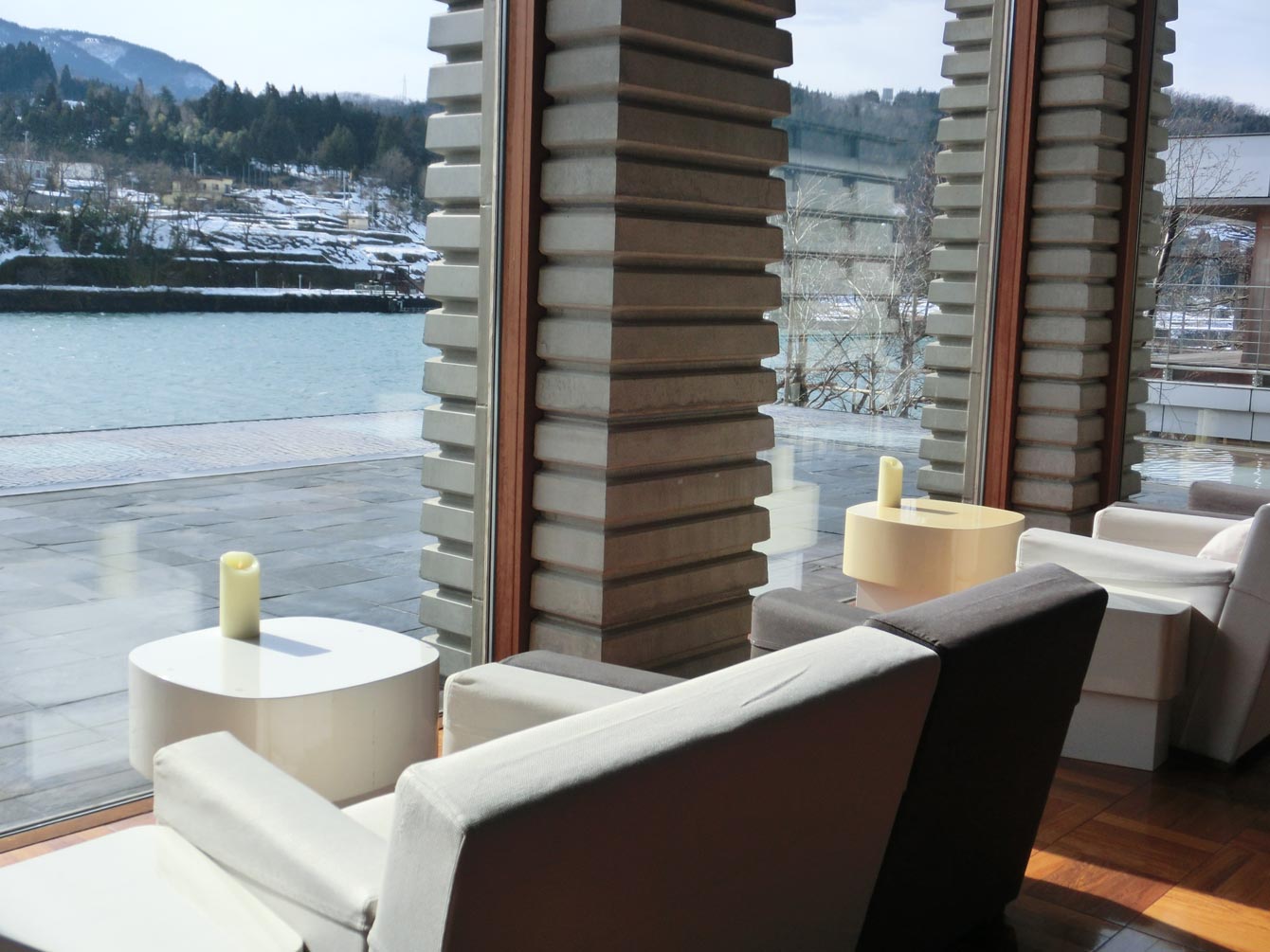 仄暗い空間をぬけると、光が降り注ぐまぶしい白の空間。窓いっぱいに拡がる神通川の水面。もしあなたが初めての来訪だとしたら、突然、リゾートに転送された感じを抱くかもしれません。宿泊客は、ここでチェックインの手続きをし、雅楽ワールドの客人となります。