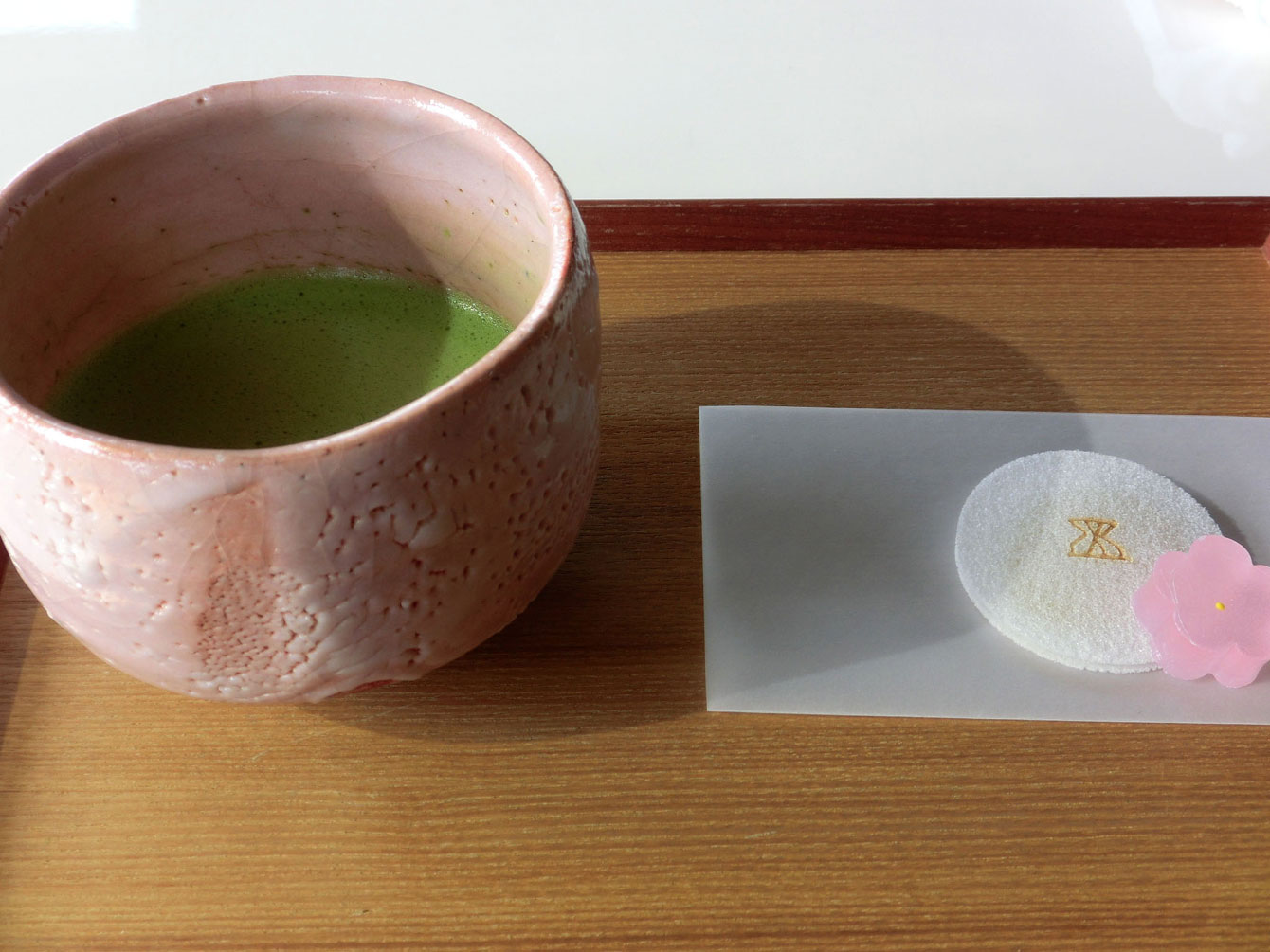 わたしたちは抹茶を選びましたが、ウェルカムドリンクは、コーヒー、紅茶、ビール、抹茶の中から選べます。添えられたお干菓子にも雅樂倶のマークが入っていました。