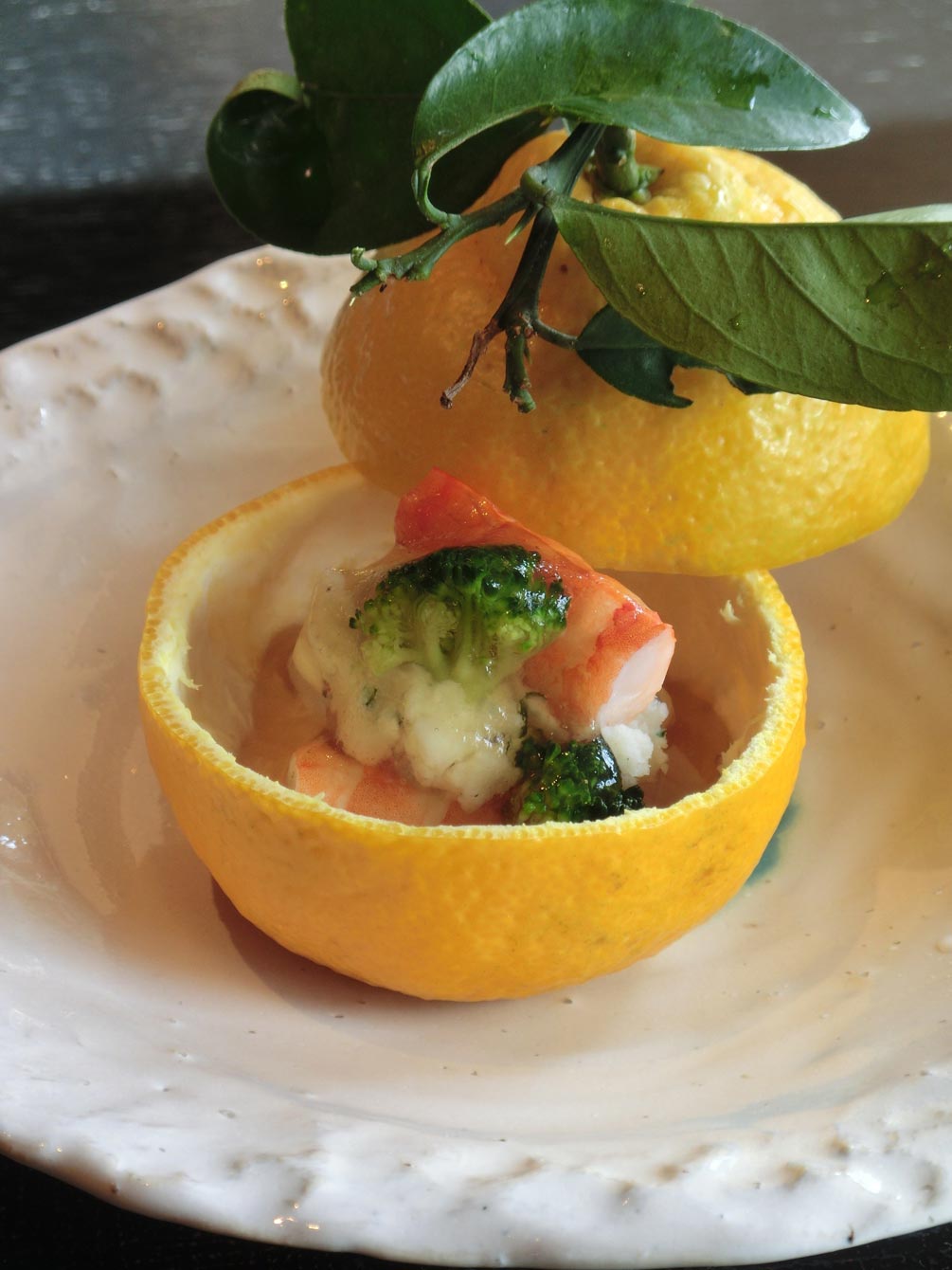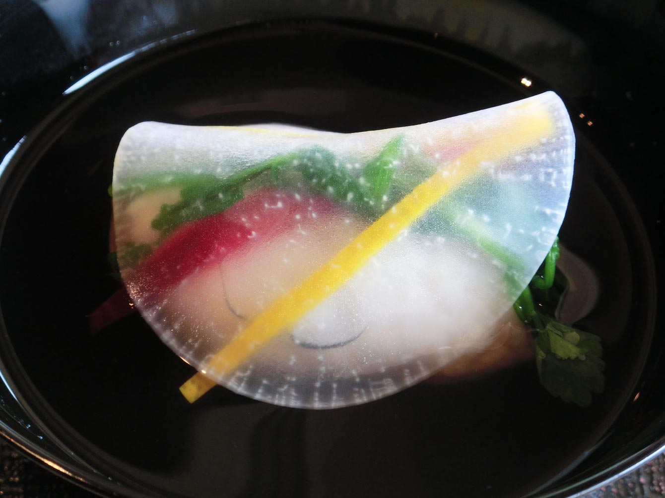 実はこの前におこわの上にカラスミが乗っている豪華な一品がでました。そして、この椀ですが、丁寧に引いてあるおだしを堪能できるだけではなく、写真には写っていませんが、お椀の蓋に鮮やかな椿の絵が描かれており、目でも十分楽しめるようになっています。
