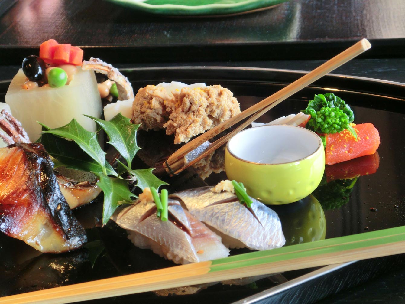 この時点で雅樂倶には和食、フレンチの2つのレストランがありました。一泊では両方を楽しむことができないと直前まで、ディナーをどちらにしようか迷っていました。ところが、雅樂倶の送迎を頼んだところ、スタッフの方が私たちの時間に合わせて迎えに来てくれるとの事だったので、ランチも雅樂倶で頂くことが出来ました。そのような訳で、ランチは祇園佐々木さんの支店の「味樂」です。写真の先附に、思わず見とれてしまいました。