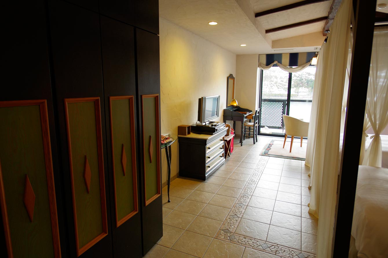 宿泊したギリシャの間は、本館2階の一番奥にあります。部屋の床は地中海風のタイル。おしゃれですが、冬はちょっと冷たかったです。