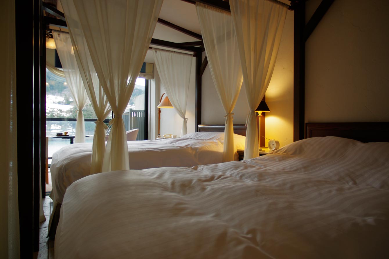 完全に外国と間違うような、夢見る天蓋付きベッド。このカテゴリーの部屋では、2室ある禁煙ルームのうちの1つです。上質なリネンで寝心地もとてもよかったです。風呂なしで、一番下のカテゴリーの部屋ですが、広さも使い勝手も丁度良く、気持よく滞在することができました。