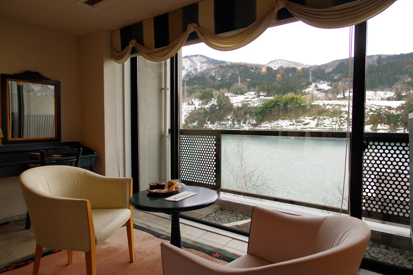 部屋からの眺めは神通川です。バルコニーには、ここが雅樂倶だと意識させるオブジェが置いてあります。ソファセットのテーブルには、ウェルカムスイーツのカステラが置いてありました。(お部屋のお茶類は無料です。)とてもおいしいので、雅樂倶のお土産にいいと思います。