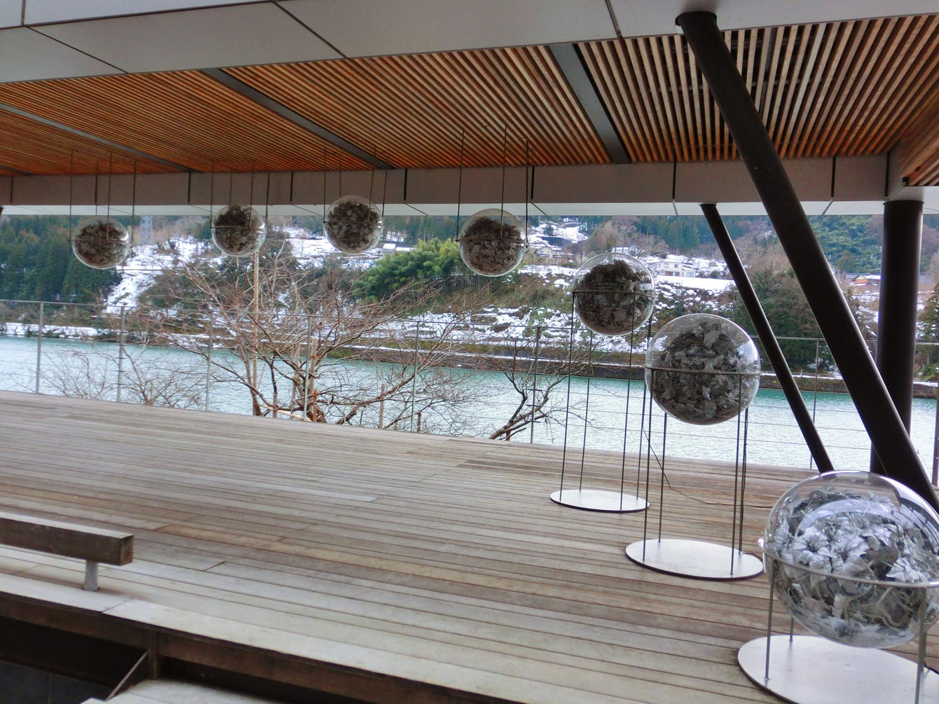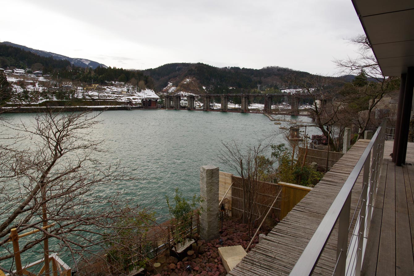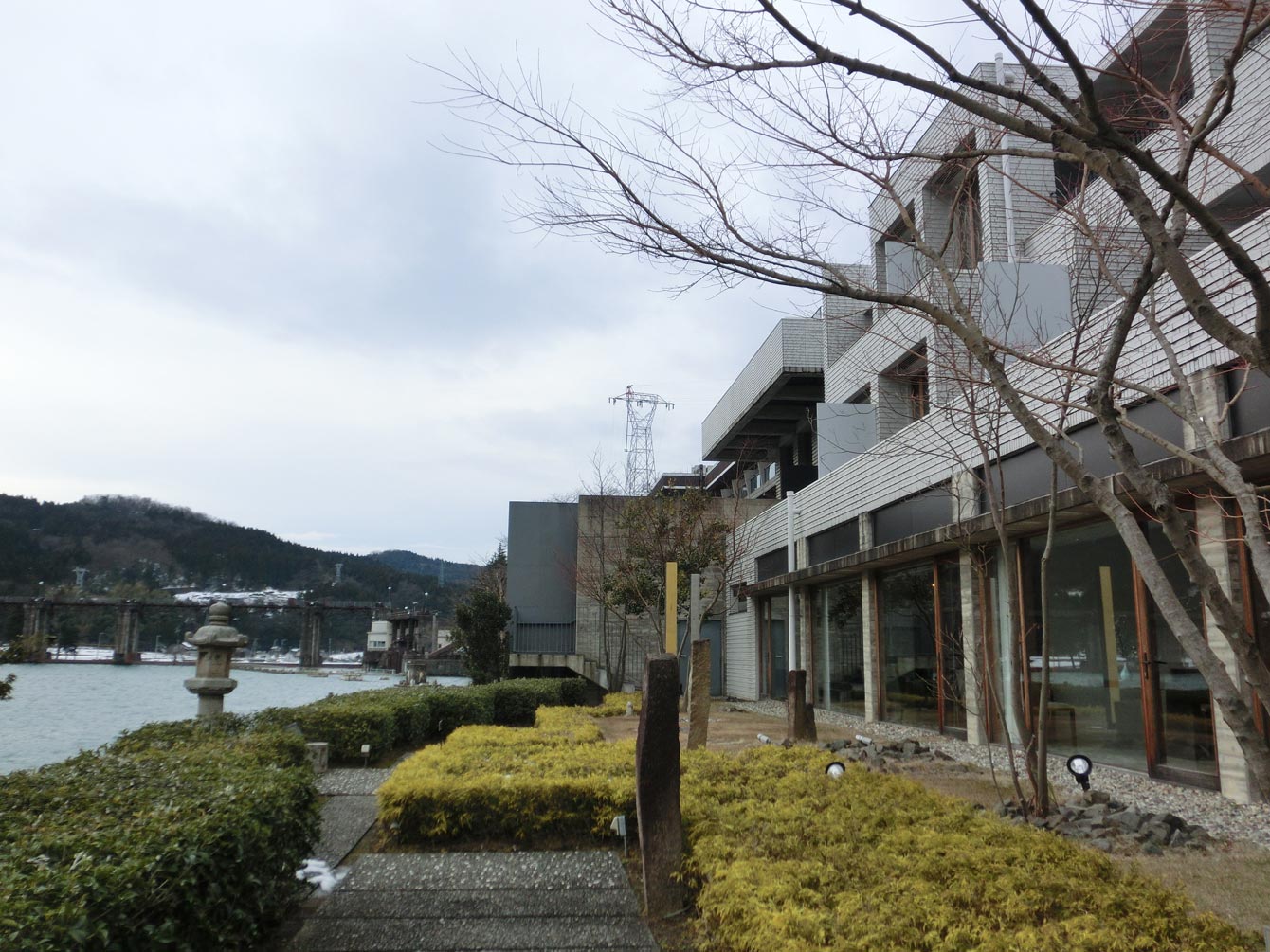 神通川に面して、アートウォークが作られていて、アートを眺めながら、ちょっとしたお散歩が出来るようになっています。写真の下の部分の赤茶けた石がある部分は、実は本館B1にある露天風呂の先端です。ダムの水門すらアートに見えます。(ちょっとこわい感じに私には見えるのですが。)
