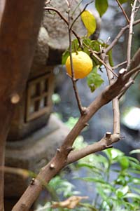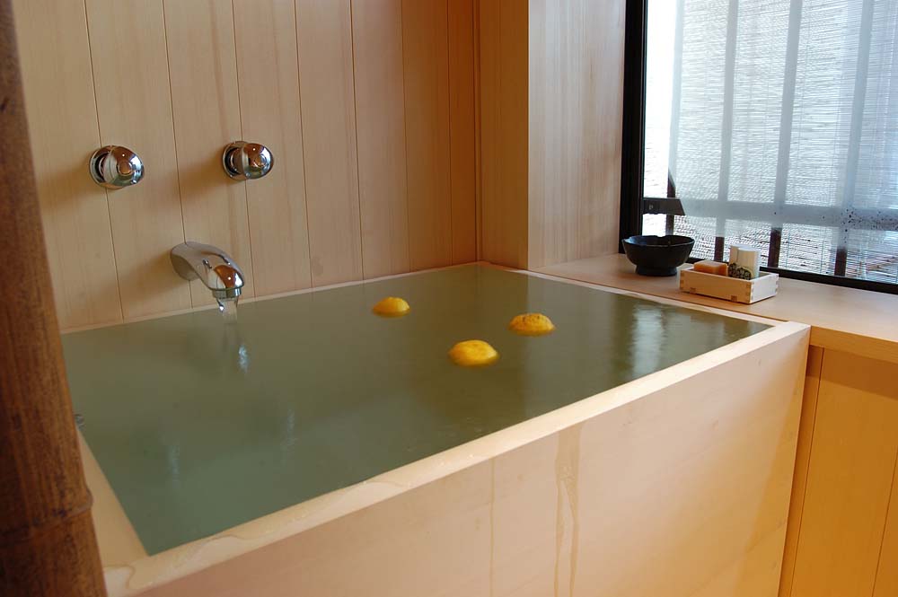 風呂の戸を開けると、柚子と檜の合わさった品のいい香りが充満している。無垢の檜を使ったお風呂にたっぷりとお湯がたまり贅沢な気分。柚子がぷかぷか と浮いている絵を想像していたが袋入りであった。