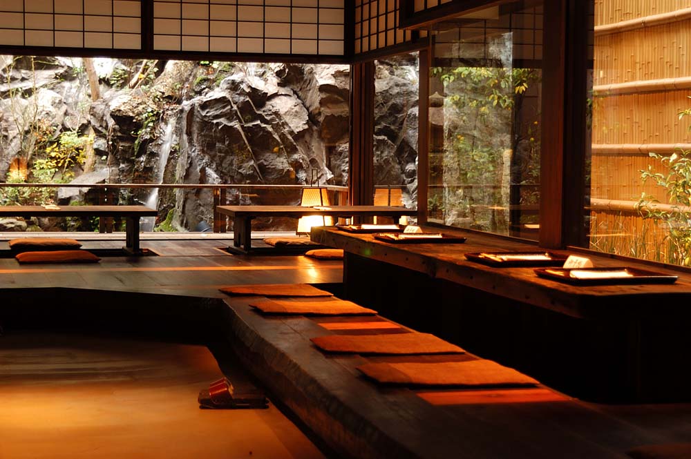 うっすらと照らし出されたテーブルを挟んでその灯りに見合ったトーンでみな大人な雰囲気をかもしている。泊まりの客のすっかりくつろいだ浴衣姿のテー ブルがあるかと思えば、ちょいとおめかし姿のテーブルは日帰りの客なのだろう。オーベルジュならではと言えばいいか、不思議な光景。