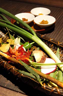 憧れだったんですこの一文字の飯。かぶらの煮物は色々な野菜が溶け出したような旨みのだしがかかる。つづいての京野菜には正直度肝をぬかれた。これを 柚子、徑山寺、鯛の三種類の味噌をつけて、まるかじりするのだ。金時にんじんがフルーツのようにあまく、鯛味噌が特に気に入った。