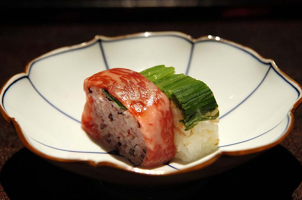 凌ぎに京都牛の棒寿司。希少な京都牛は舌の温もりで溶けて古代米と混ざり、まったりと口の中に漂ったかと思うと、すっと消えていった。極上の味に喜 悦!