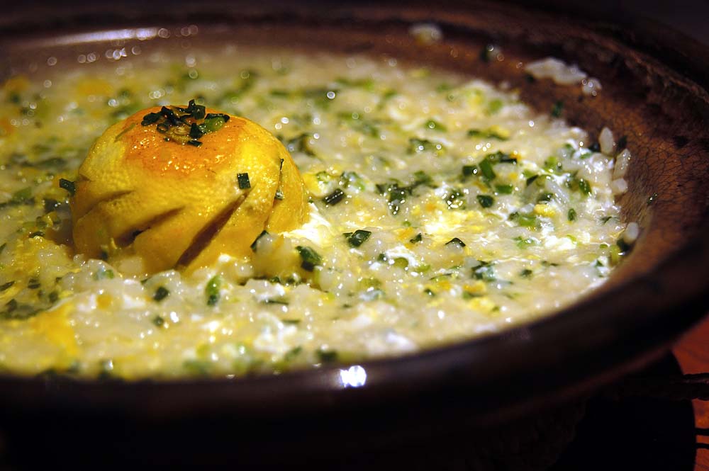 いよいよ柚子のクライマックス。まずは鯛鍋で鯛の刺身を出汁にしゃぶしゃぶくぐらせ鯛しゃぶ。こんどはその出汁をつかって雑炊、これが旨いのなんの! 卵を溶いてから、おたまで柚子を押すと切込みから汁がじゅわりと飯に染み出す。柚子の品のあるさわやかな雑炊でした。