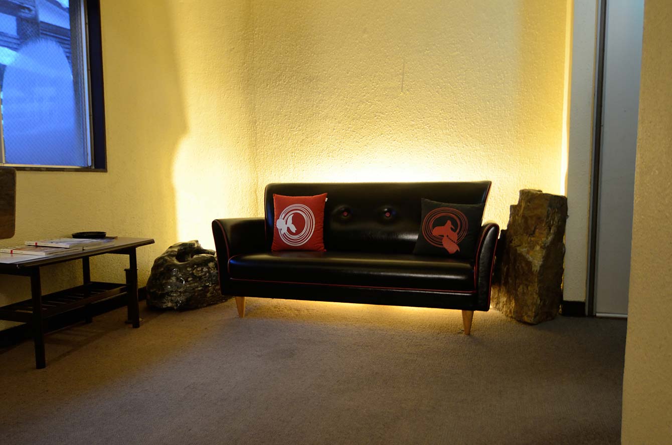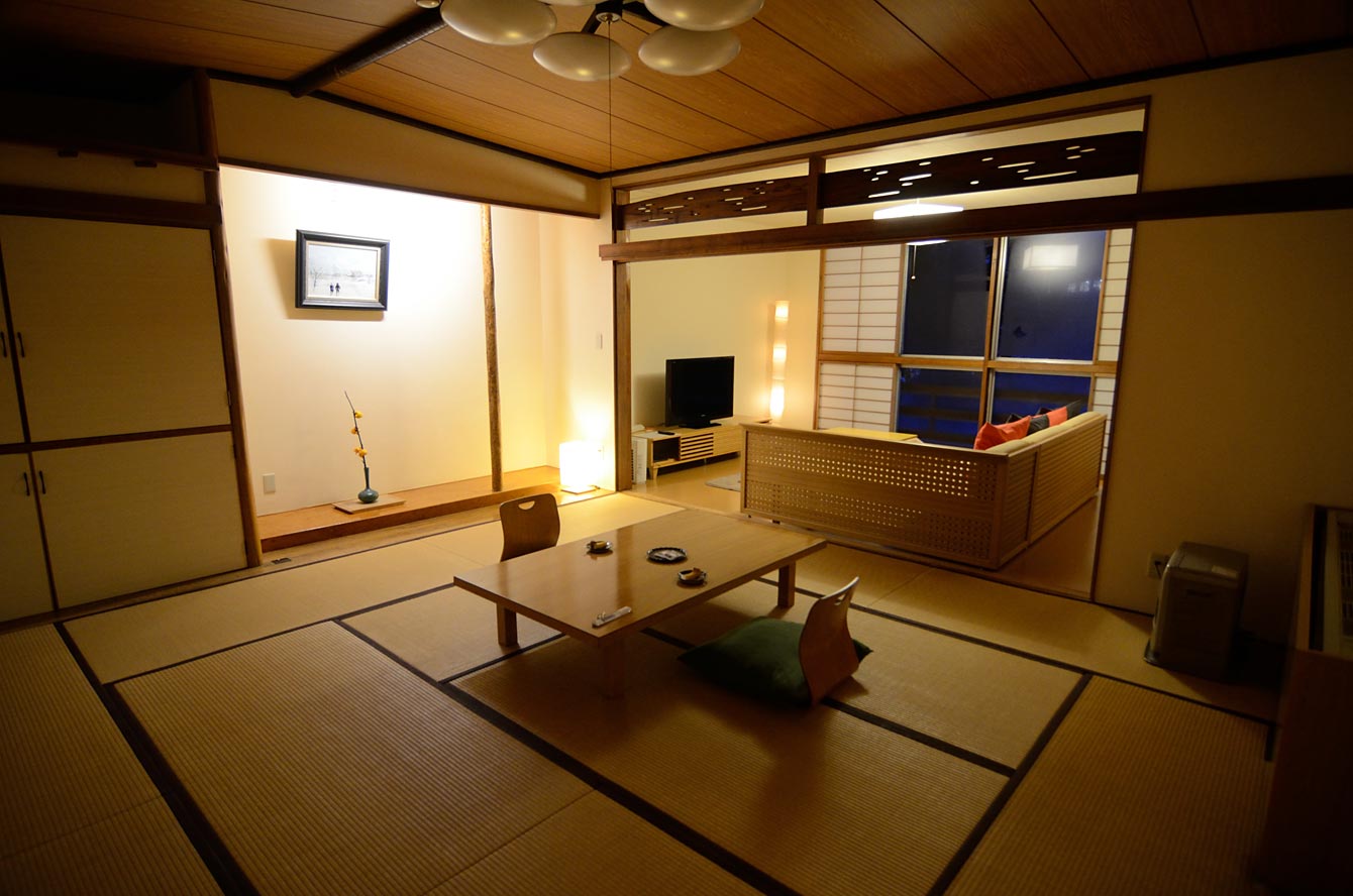 主室は電気が消されていて、ソファーのある広縁のほうに間接照明が灯っている。