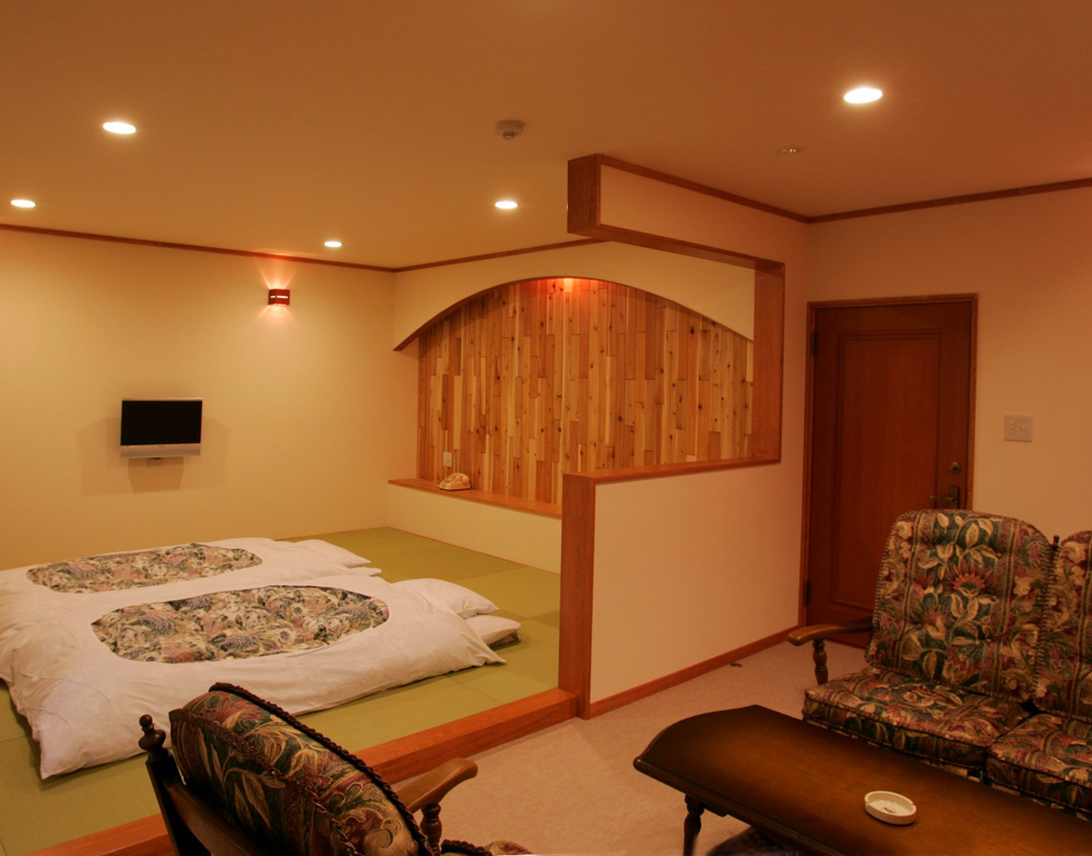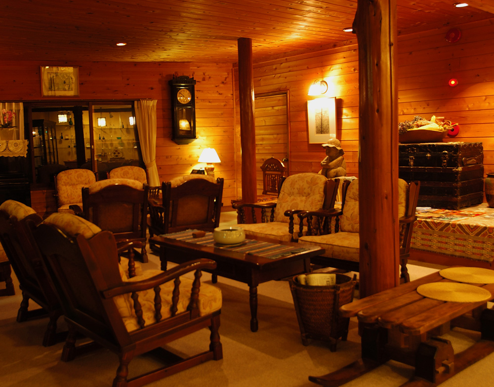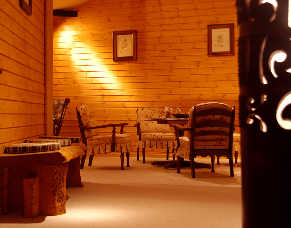 木のぬくもりを大事にした館内に身を置いていると、 心から安らいでやさしい気持ちになる。 ロビーには飛騨高山の職人が造った特注のテーブルセットやペルシャ絨毯などが飾られている。素敵な雰囲気だ。