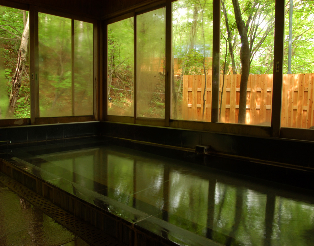 大きく開かれた窓からは くり、もみじ、さくらなどの木々が美しい。宿でのいちばん人気のお風呂。