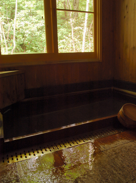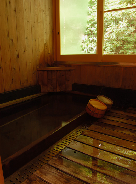 木風呂すきにはたまらないお風呂。湯船からあふれるおゆがとてもなめらか。 夫婦2人で入るにはちょうどよいこのお風呂も窓を大きくリフォームし、四季を彩る木々を楽しみながら入浴できる。