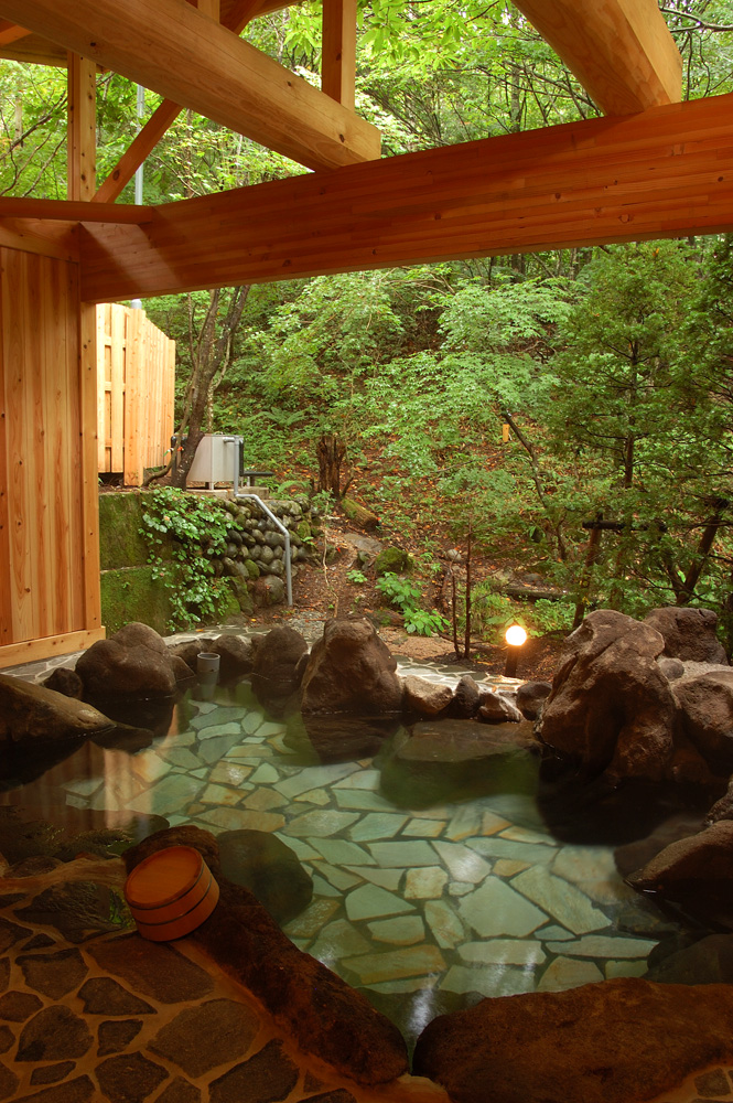 いったん玄関を出て、木々の中を歩くとすぐにあるのがこの前の湯。森林浴を楽しみながら入る露天は目にも体にも優しい。前の湯から少し奥にある階段を上がると笠ヶ岳や錫杖岳が眺められる奥の湯もまた格別。