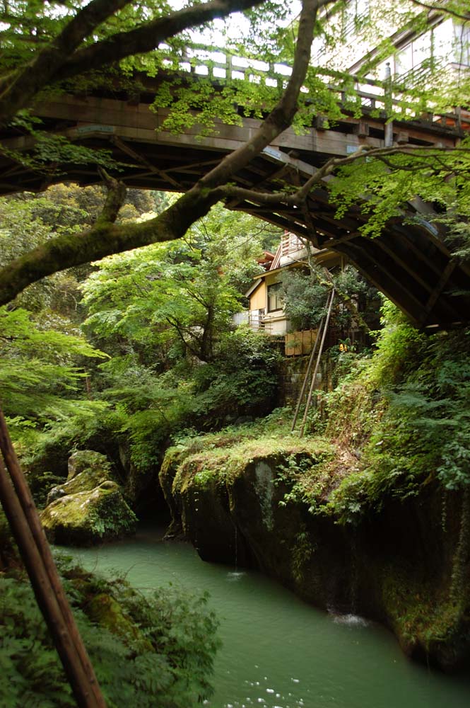 鶴仙渓沿いの遊歩道をつたってこおろぎ橋までいってみる。苔むした岩、木々の緑、川風が軽く汗ばんだ肌にここちいい。