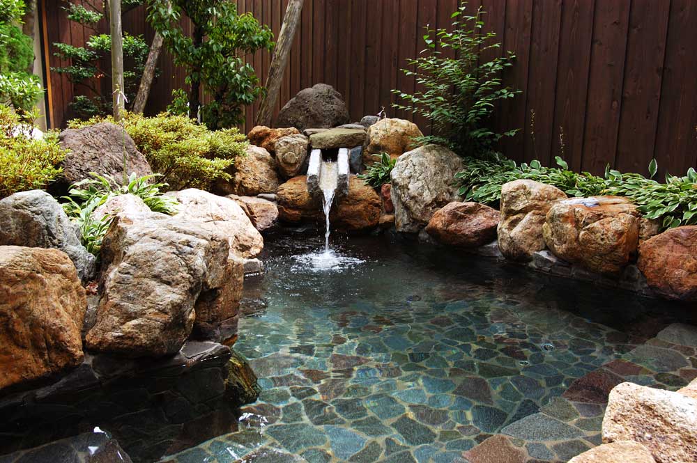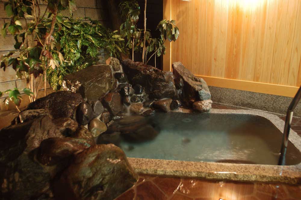 大浴場の露天風呂。大きさはあまりないが、庭園風呂の雰囲気はなかなかいい。お湯は山中のシンボル「総湯 菊の湯」と同じもの。見た目にはあまり特徴 はないように見えるが、硫酸塩泉という結構珍しい湯だ。旅の疲れをすっきり洗い流すことができた。