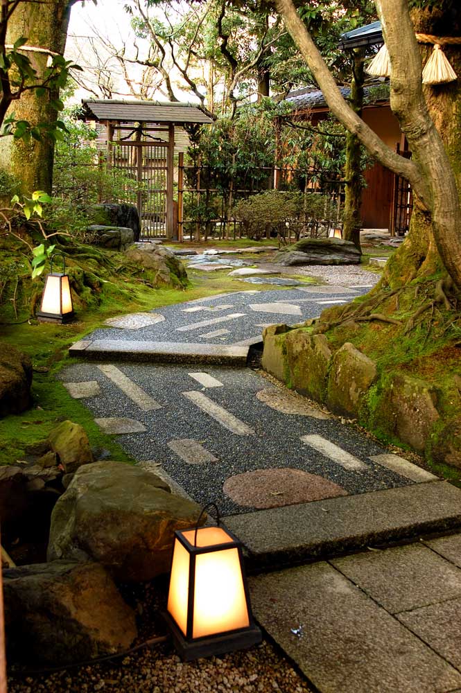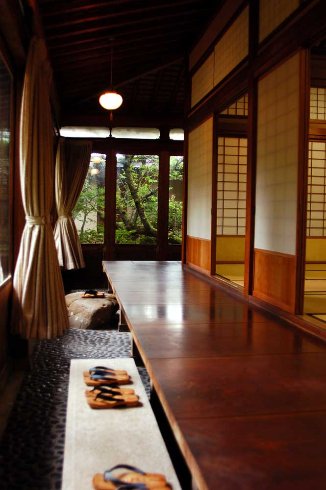 打ち水されたアプローチが玄関まで導きます。今日は子連れだが、泊まるのは離れなので他のお客さんに迷惑をかけることはなさそうだ。しかしいろいろ国 宝級のものがたくさんある宿なので子供たちが粗相をしないかとっても心配。