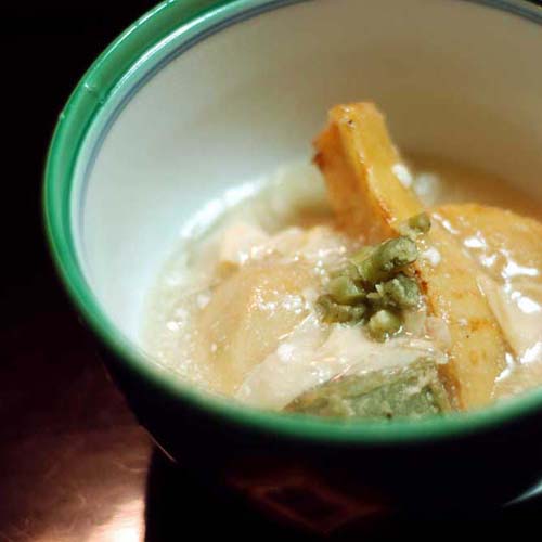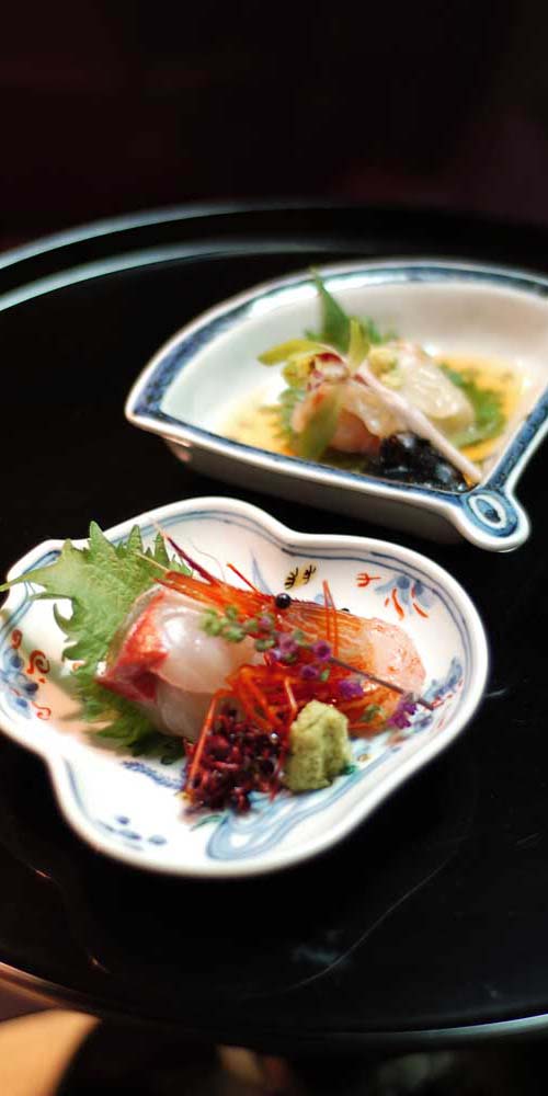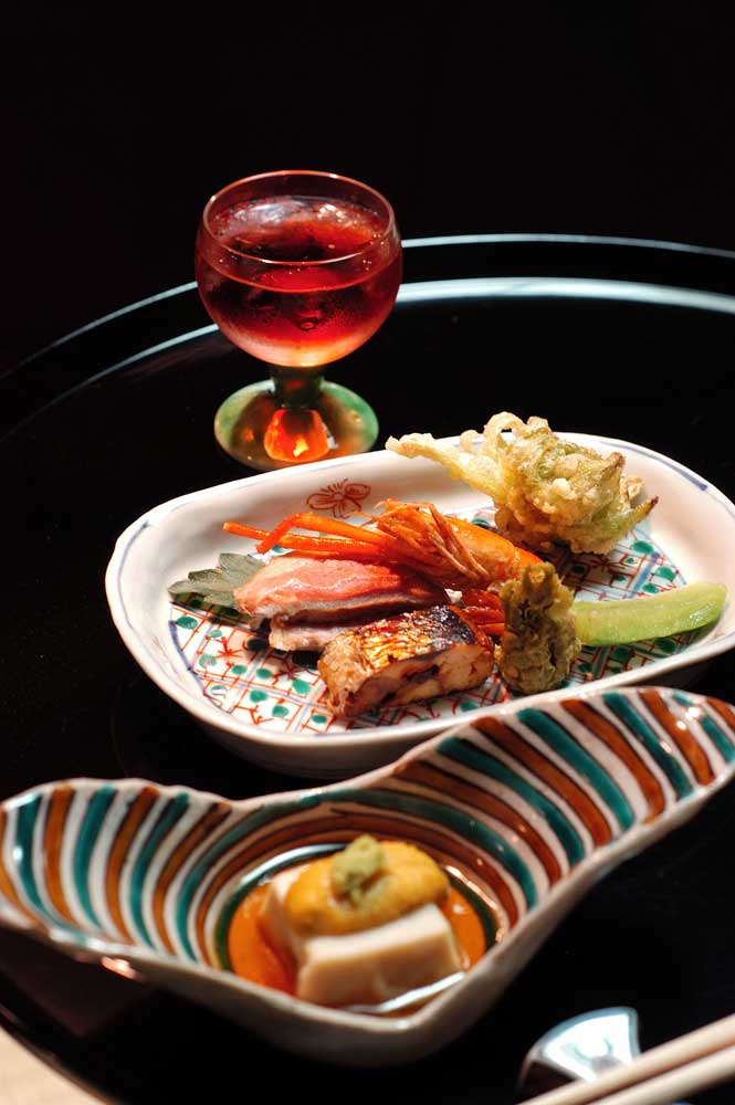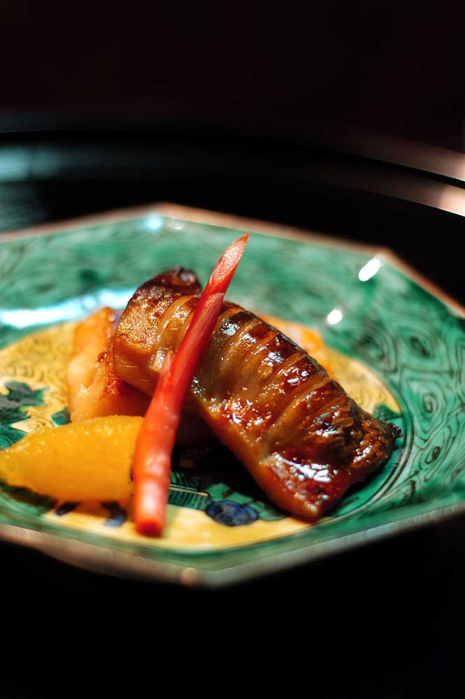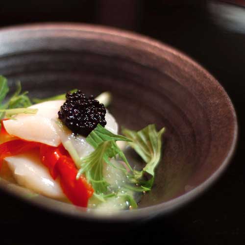 ひょうたん型の器には島アジと島エビ。扇形には甘鯛の昆布〆。そして竹の子の湯葉あんかけ、ホタテをりんご酢で合えてキャビアのせに。島アジって多分 はじめて食べたのですが、これもおいしかったなぁ。